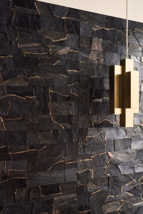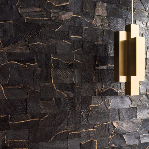 UmweltfreundlichVega: Eine Collage aus getönter Kokosrinde mit rohen Oberflächen, die die innewohnende Noblesse des Materials offenbart.