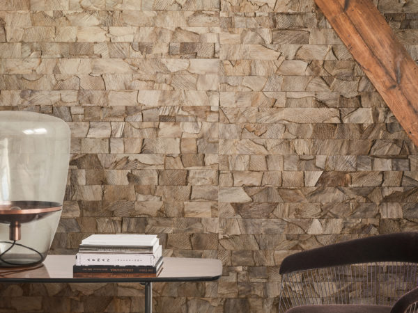 Vega: Eine Collage aus getönter Kokosrinde mit rohen Oberflächen, die die innewohnende Noblesse des Materials offenbart.