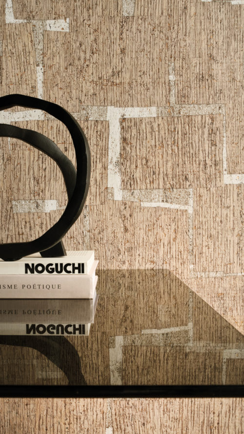 Eco-responsableNorma: Un motif géométrique raffiné imprimé sur du liège, alliant la chaleur naturelle à une structure contemporaine.