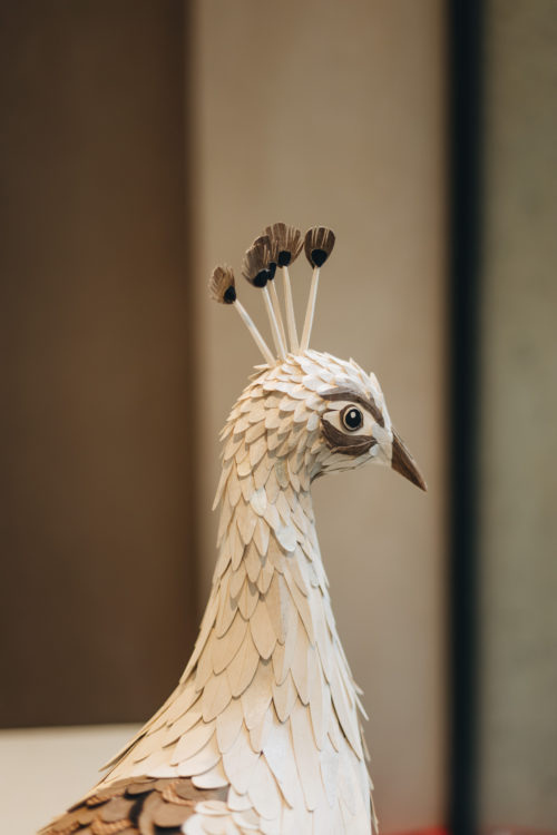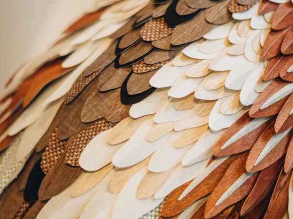 Cette installation met en lumière la polyvalence des matériaux, réunissant textures, profondeur et savoir-faire pour créer une véritable œuvre sculpturale. Chaque plume, soigneusement composée à partir de revêtements muraux et de matières brutes, incarne le raffinement et la diversité des collections Omexco.