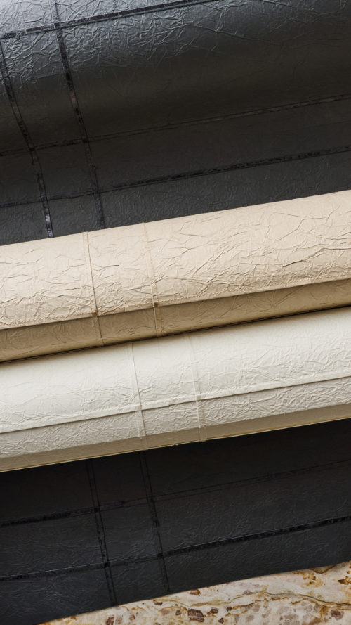 Eco-friendlyRigel: Delicate marquetry of artisanal paper, enhanced by topstitched pleats.