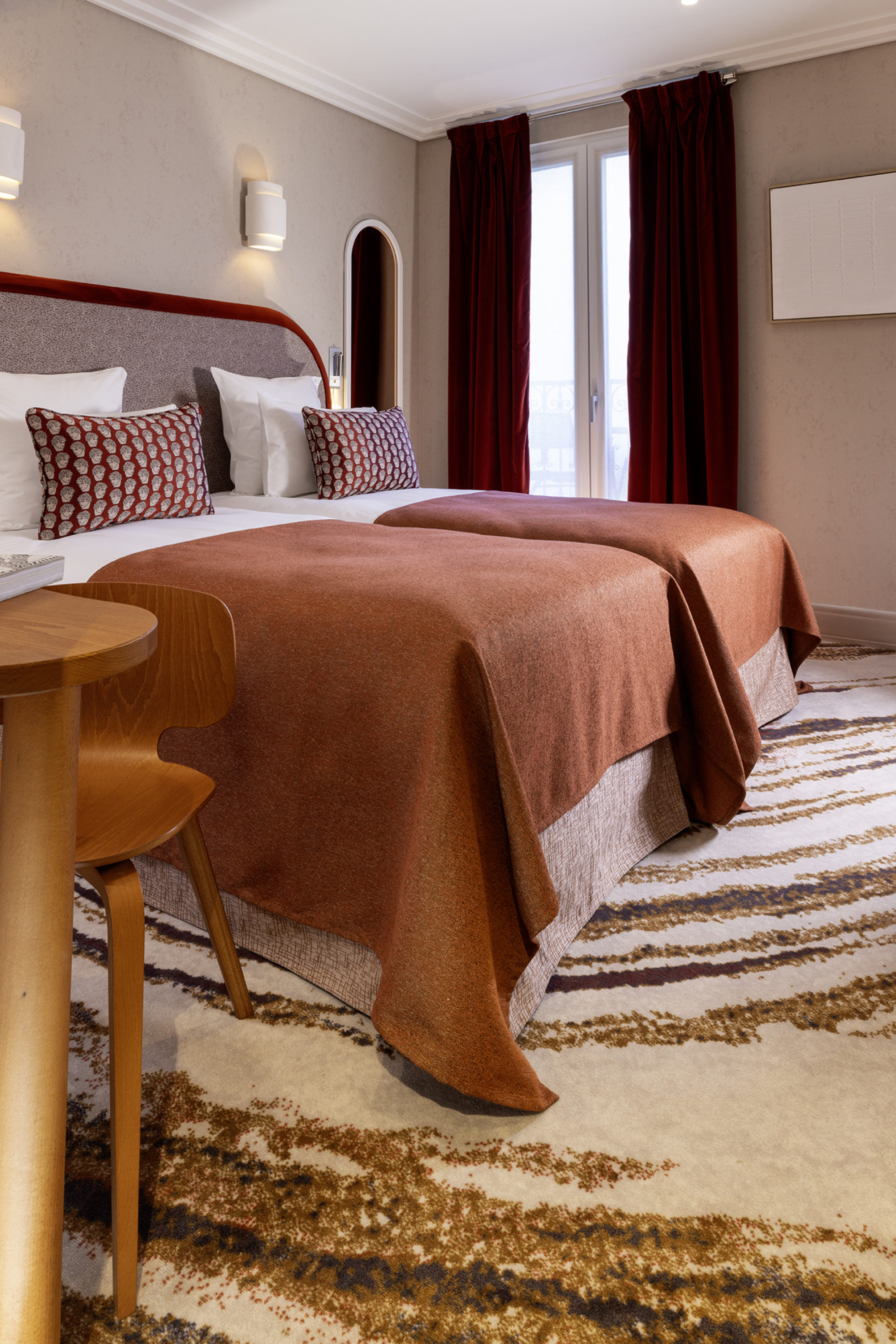 Dreaming in shades of pink in the heart of Paris! 4 Star boutique hotel Hôtel des Carmes adorned with our High Performance Patina « Sandstone » wallcoverings.