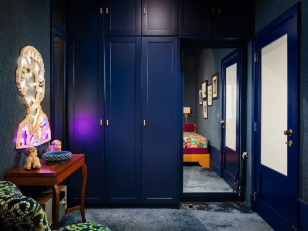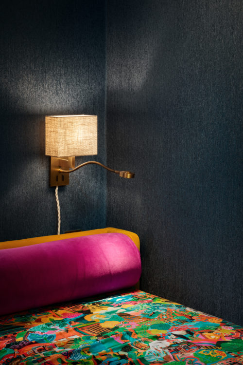 As you explore further, you find a dramatic shift in mood: deep blue wallcoverings in the bedroom create a cocoon-like intimacy, enriched with playful lighting and bold, colorful textiles that spark personality & joy.