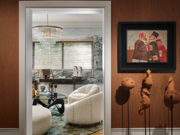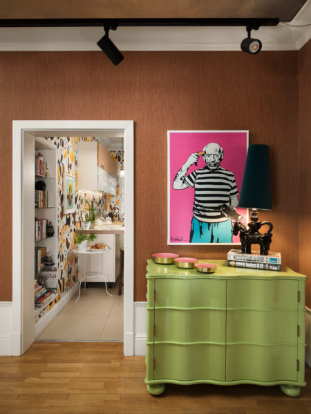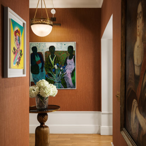 Richly textured walls add warmth to the hallway, perfectly complementing vibrant art and offering a glimpse into a playful terrazzo-inspired kitchen.
