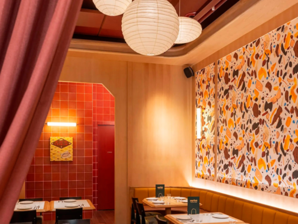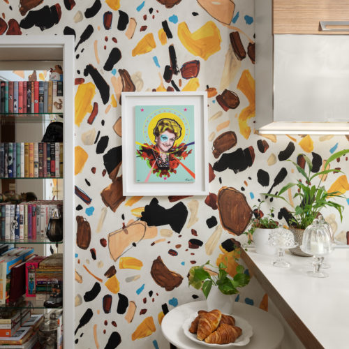 As you step inside, the hallway greets you with rich terracotta wallcoverings that bring warmth and sophistication to the space, a high-performance choice that combines elegance with durability, ideal for areas where life happens most. In the kitchen, bold terrazzo-inspired walls burst with color and energy, creating a joyful backdrop where cooking and conversation blend effortlessly.